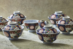素焼き後に絵具で染付という下絵を行い、本焼成後に上絵を施すという染綿の技法を用いて作られた蓋付丼です。